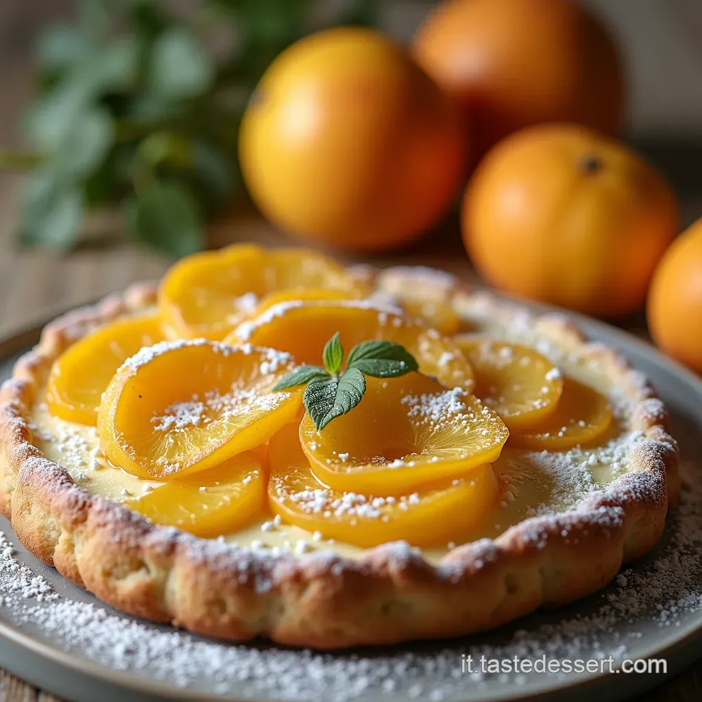 Crostata Morbida Sovraccarica Labbraccio Vellutato Di Crema Pasticcera E Pesche Fresche
