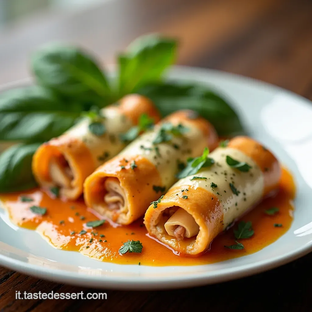 Come li serviamo? Semplice, ma con stile. Gli involtini, belli dorati, vanno messi al centro del piatto. Poi, dai, esaltiamo la loro bellezza con un bel cucchiaio di Salsa cremosa keto sopra.