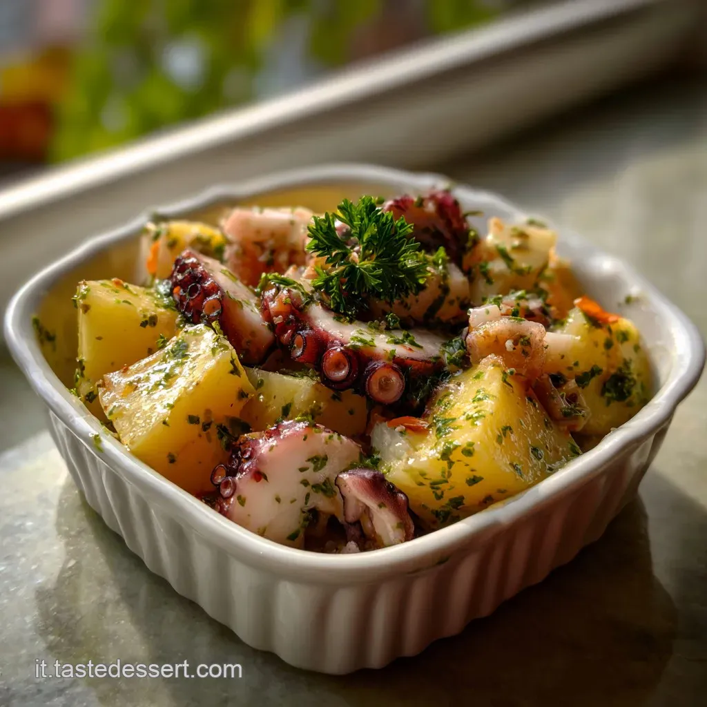 A classic Mediterranean salad of slow cooked octopus and boiled potatoes. This dish balances the savory, yielding texture of the mollusk with the soft starchiness of the potatoes, typically dressed in olive oil and lemon juice. It serves well as an elegant appetizer or light main course.