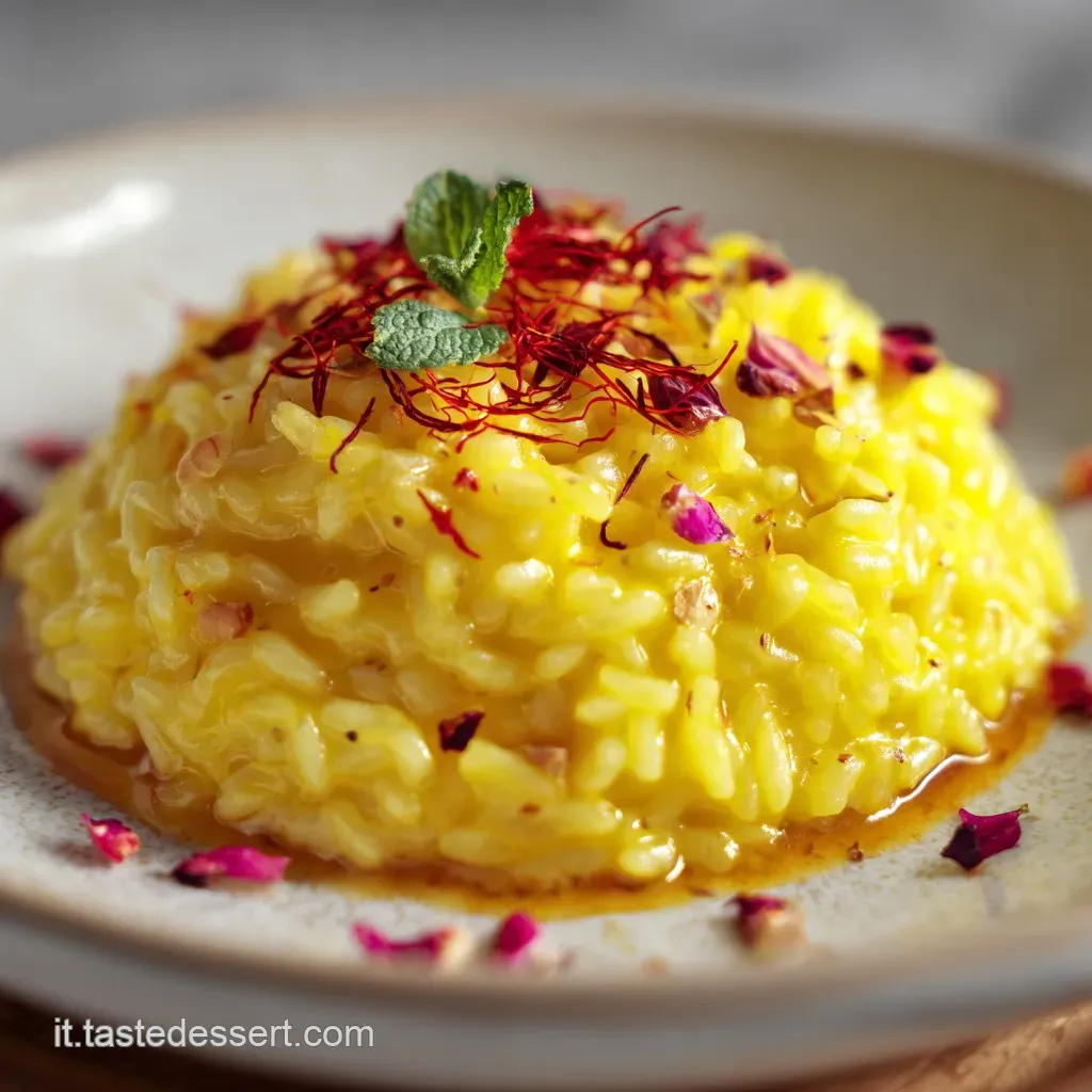 Puoi decorare con qualche pistillo tenuto da parte o, per un tocco moderno, con una grattugiata di liquirizia pura in polvere. Il contrasto tra il dolce dello zafferano e l'amaro della liquirizia è una vera esperienza gourmet.