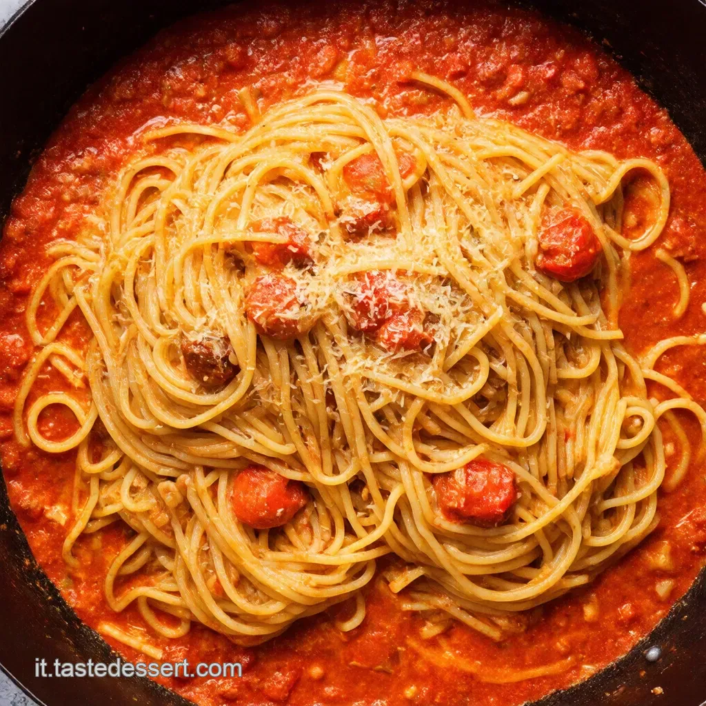 - Unisci pasta e sugo: Scola gli spaghetti e versali nella padella con il sugo. Mescola bene, aggiungendo acqua di cottura se necessario per creare una salsa cremosa.