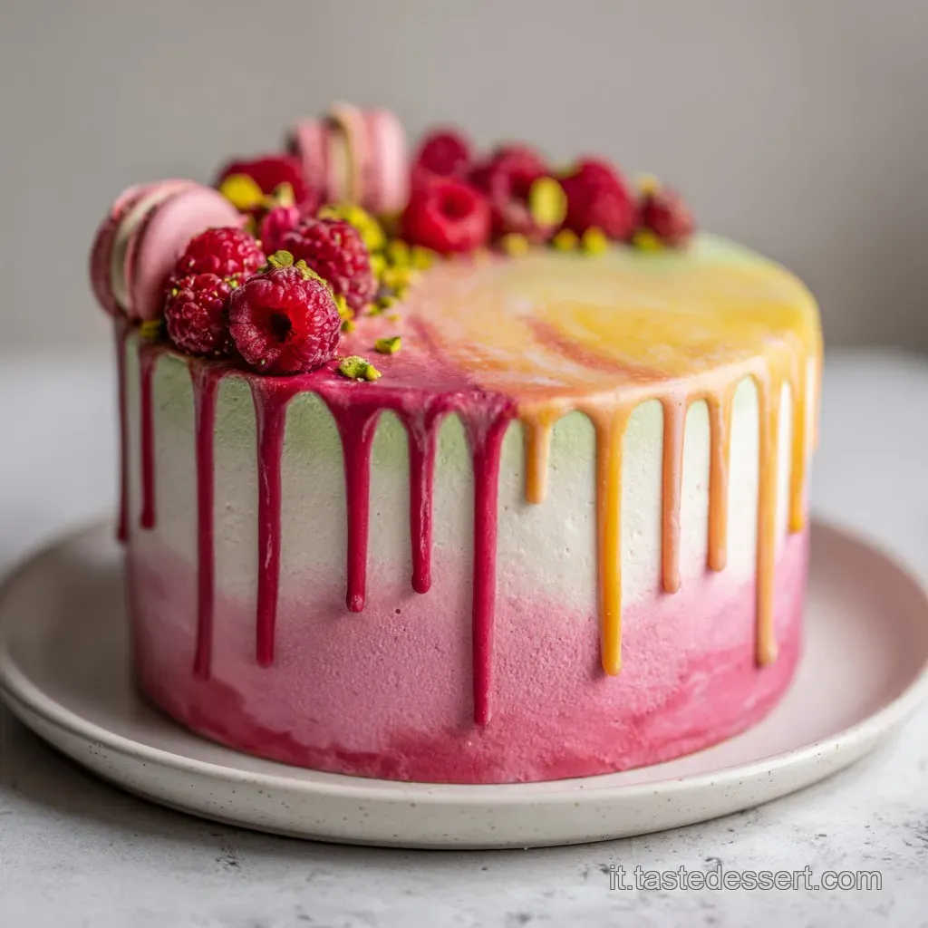 Sostituite la pasta di pistacchio con 40g di cacao amaro e aumentate il latte a 70ml. Utilizzate ciliegie sciroppate o amarene al posto dei lamponi. Il contrasto tra il cioccolato fondente e la crema bianca creerà un effetto visivo drammatico e sofisticato, perfetto per una torta di compleanno originale e bella.